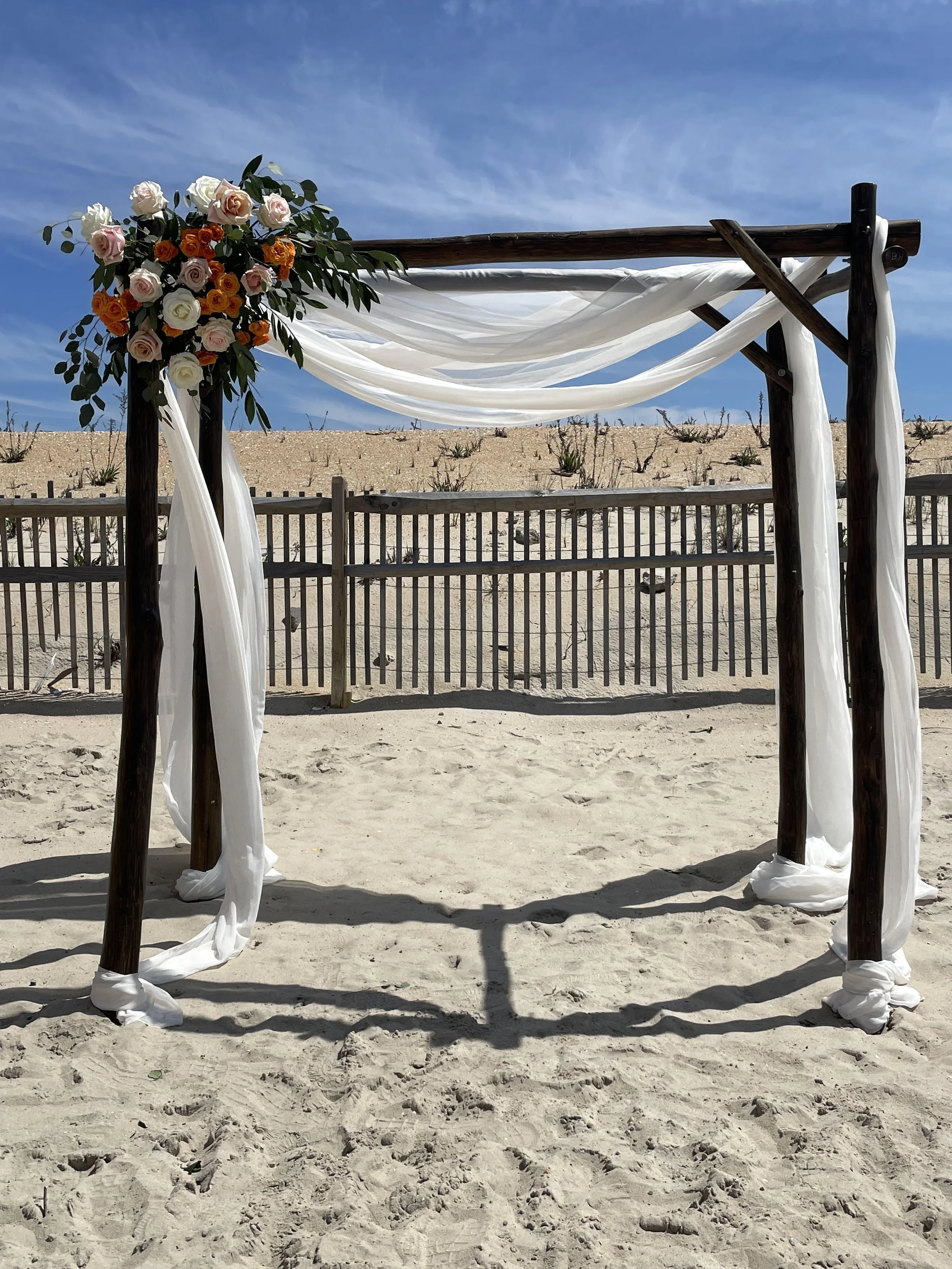Bride and groom at beach wedding ceremony under decorated wooden arch with flowers